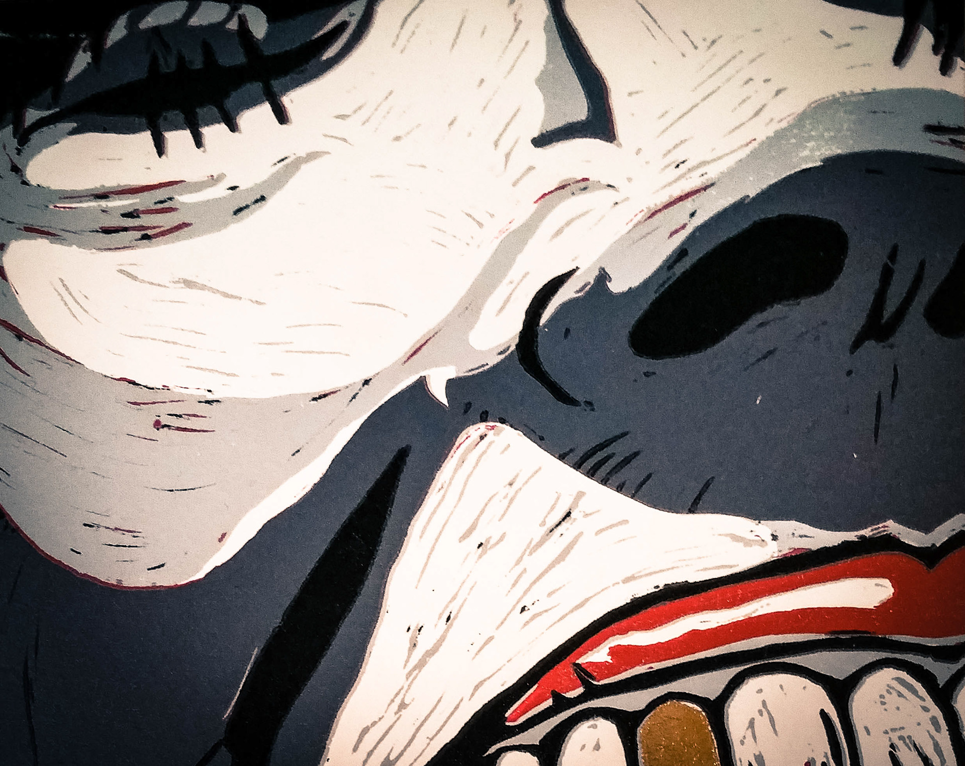 This is student work for a Day of the Dead project at California State University Northridge. I wanted to incorporate traditional imagery such as the sugar skull, but in an impactful, and more graphic way. I molded a sugar skull out of a kneaded eraser and had my daughter hold it between her teeth while I photographed it. I then adjusted the color and contrast of the photo in Adobe Lightroom CC to more easily break down how I would separate the colors for the final print. Once the photograph was cropped in an interesting way, I enlarged it and traced the various elements I wanted for each of the separated colors. Each layer was transferred to the linoleum block, carved away, and then printed separately. Once the layer is carved and printed there is no going back since it is a reductive process. This means that careful planning is required, and any mistakes need to be incorporated into the design. After the four layers were printed, I added gold leafing to the tooth.