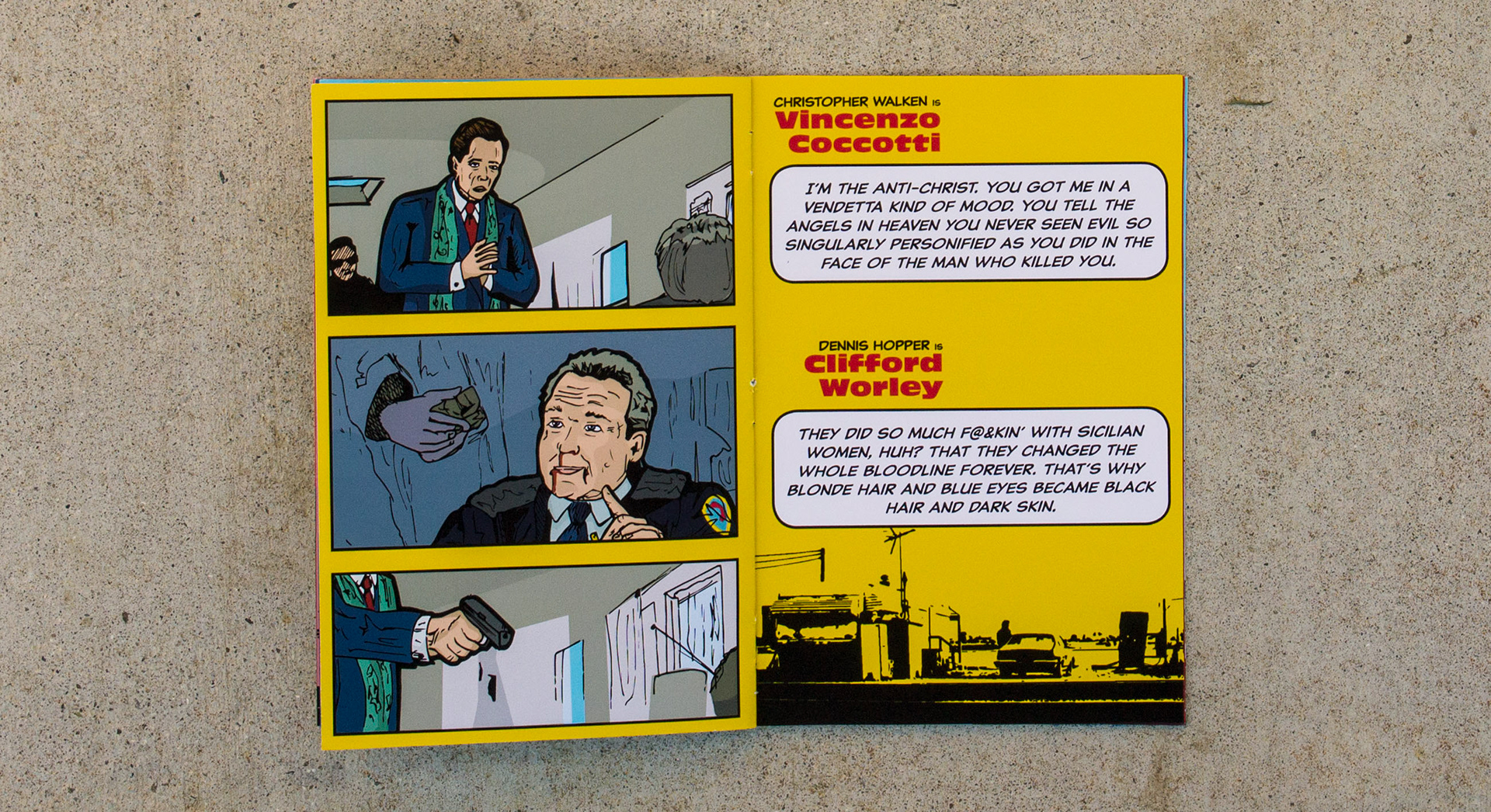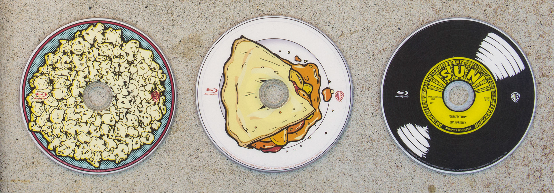 For my True Romance Bluray package design, I wanted to start with a reveal. When the acetate slip cover is on, we see our stars in their signature clothing styles and funky sunglasses. When the case is removed, we see the transformation from when their love affair first began, to after their rollercoaster of a ride dodging FBI agents and Mob Bosses. Each panel of the inside case is inspired by pivotal moments between Clarence and Alabama. Panel one is Vista theater, where Alabama first meets Clarence when she "accidentally" spills her popcorn all over his lap. Slip out the disc to see Alabama's popcorn bucket. Alabama and Clarence both discover that they like to get a piece of pie after seeing a good movie, a kung fu triple feature to be exact. They make their way over to Rae's Diner, and the romance evolves. The disc contained inside is a plate of peach pie. When the couple makes their way back to Clarence's apartment, we discover how much of an Elvis fanatic he really is. A bust of The King with votive candles provides just the right amount of mood lighting as our couple seals the deal. This blue ray takes us back to when The King reigned at SUN Records. When Clarence shows Alabama his place of employment, Hero's For Sale, a cool little comic book shop, he shows her a comic book, and tells her the story of true love that really sparks the passion and love between the two stars. The cover of the booklet is a replica of that comic. Open the pages and check out this star-studded cast, and read some of their most memorable lines from the film by Tony Scott. Hopefully my project will inspire those who haven't seen True Romance to do so. You won't regret it!